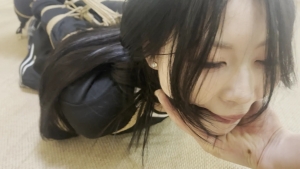 穿着空姐服吊带黑丝的杨若雨被五花紧缚后双足离地吊起,股绳与五花的绳结承担全身体重,痛苦难忍,无奈双足够不到地面。后被双足折叠紧缚,还戴上大红口球,头被迫抬起,全身供起,独留她一人在空中悬吊。这样的捆绑调教后,她声音魅惑……
