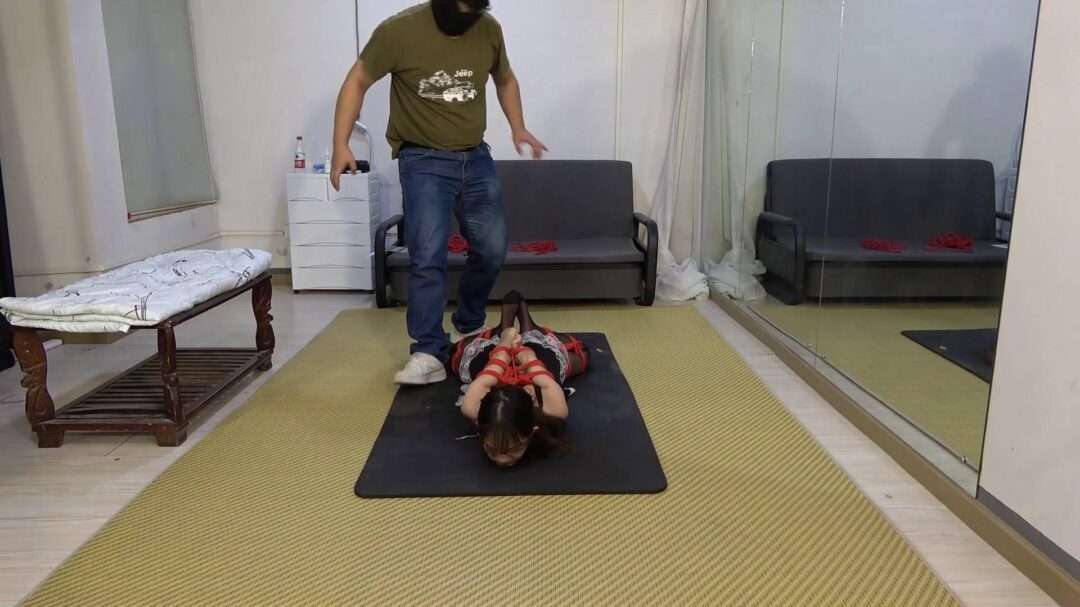 美女荣荣格子裙 反扭 手铐脚镣 蒙头堵嘴 押解跪缚