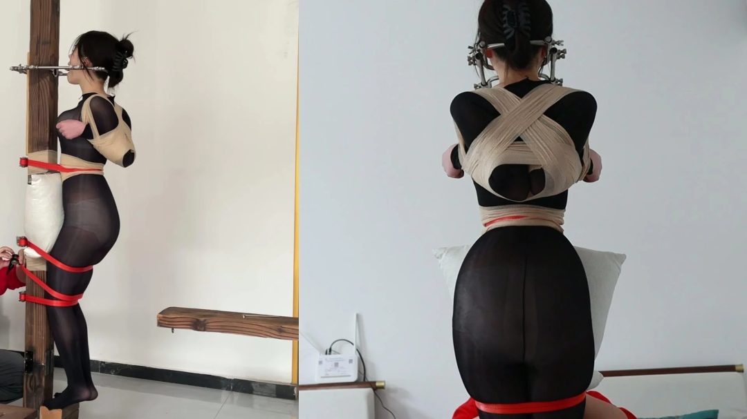 接上集,高强度的禁锢 似乎比打屁股更可怕,她被蒙眼睛 勒嘴巴 “安装”在柱子上! 不知道时间一会儿就懵了 崩溃了。大概一小时之后 才从支架口枷上放下来,让她稍微能活动下。。。只是是稍微能活动下,给她食物 让她戴着枷锁吃饭。。 ……
