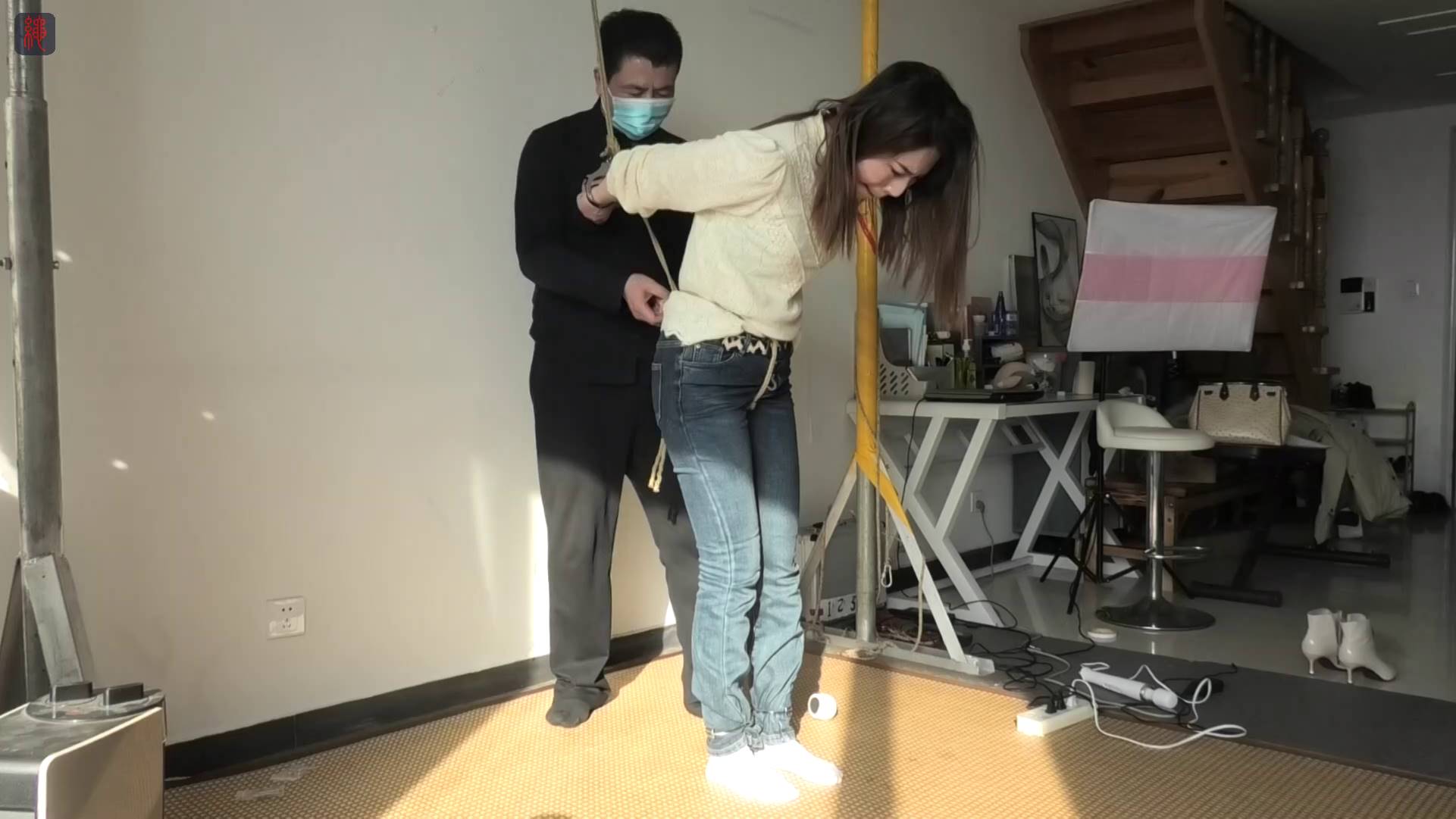 长腿美女文文大字型站立束缚、蒙眼